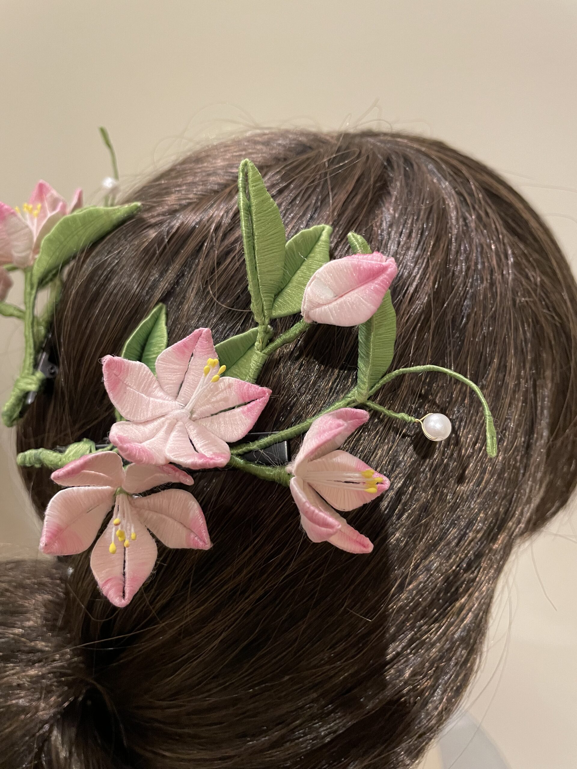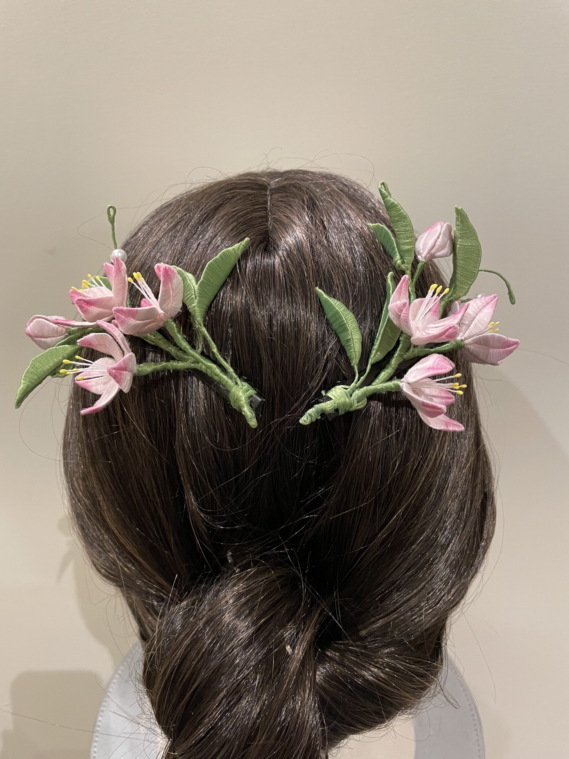 A pair of pretty hair clips each featuring three pink flowers, several leaves and a bud, made using the ancient Chinese craft of Chanhua or silk wrapping. The flowers have delicate stamens in the centre.